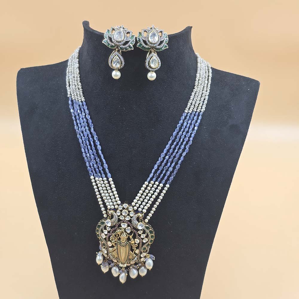 A beautiful moissanite necklace set with a deity pendant, pearl drops, Comes with matching earrings.
