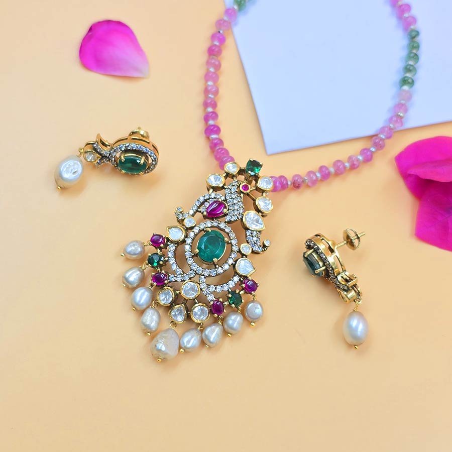 A gorgeous pendant set with a big green stone, moissanite, hanging pearl drops, and Comes with matching earrings and a pink bead chain.
